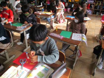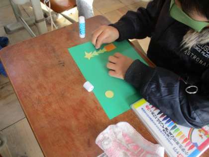 今日の外国語では,グリーティングカードを作りました。いろいろな形をカードに貼ってのグリーティングカード作りです。貼りたい形を先生からもらいます。形をもらう時は,「〇〇(何色の)△△(何の形), please!」と言わなければなりません。子ども達は,「Red circle,please」や「Green triangle,please」などと言いながら形を先生からもらい,カード作りを楽しみました。
