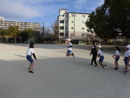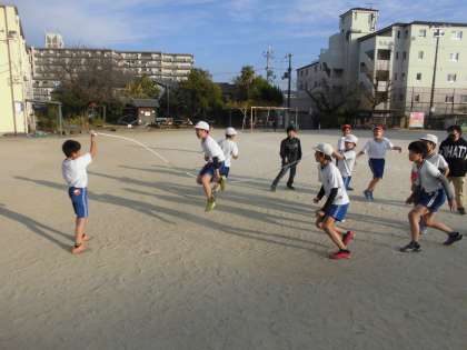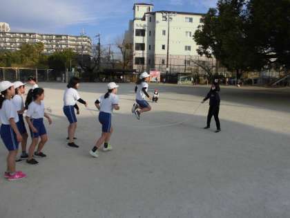 体育の学習では,一人一人が自分のめあてをもって縄跳びの練習を頑張っています。リズムよくいろいろな跳び方で跳ぶことができるようになってきました。もうすぐ始まる冬休みにも,体力の向上を目指して練習をしてほしいと思います。また,大縄跳びで8の字跳びを練習しました。連続で上手に跳んでいました。