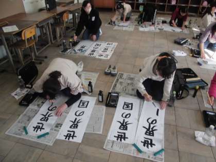 今週は,新年の目標を考えたり,席替えをしたり,とても長い画仙紙に「世界の国」という書き初めをしたりしました。4つの文字を心を込めて字形のバランスや大きさなどにも気を付けて書きました。書き初めの作品は,高学年ルームに展示する予定です。美しい力強い作品ができました。