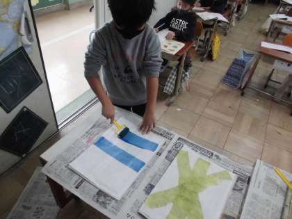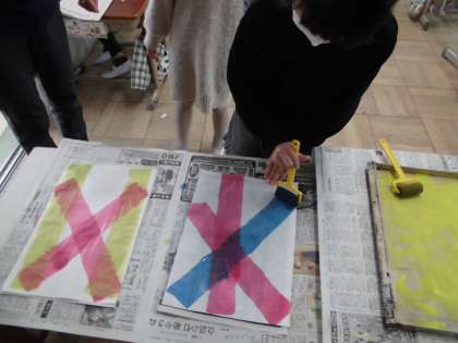 版画の背景をローラーで塗りました。