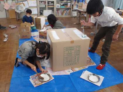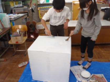 今日は,大きな段ボールに,何やら白く色を塗っています…