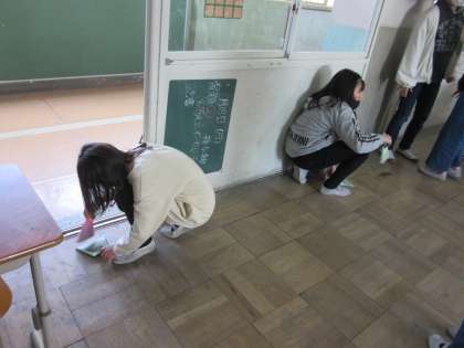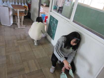ミニほうきとちりとりを使って教室のすみずみまできれいにしようとがんばっています。また,いすの足の裏などもごみがたまるところなので,自分から気づいてごみやほこりをとっています。