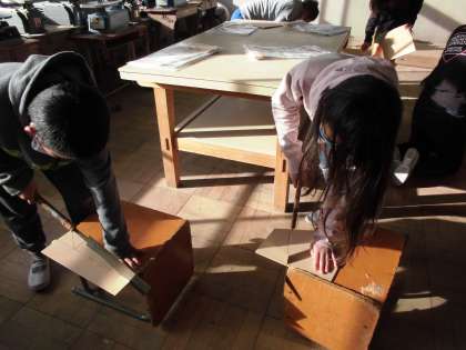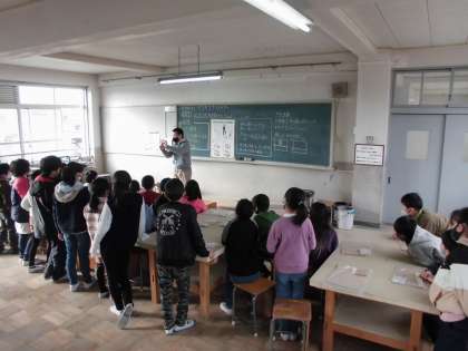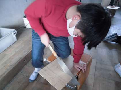 4年生では,のこぎりを使います。 はじめてのこぎりを使う日。 まずよく注意事項を聞き,切ります。