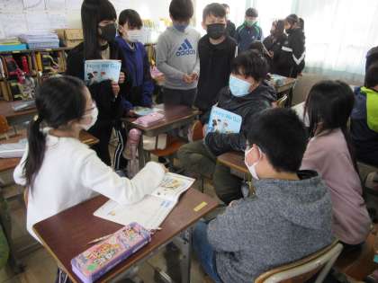 外国語の授業でグループ交流をしました。I like〜,I playl〜,Ihave〜,I want〜の文を作り,だれのことか当てるクイズをして楽しく学習に取り組みました。