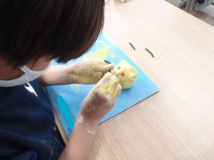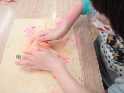 色をつけたい人は,絵の具もいっしょにコネコネ。