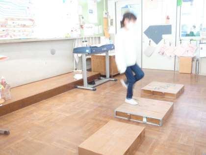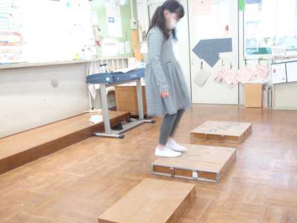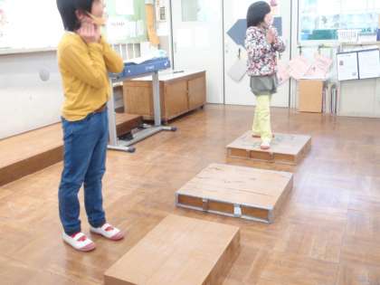 くすのき学級ではまず,台を使って,リズムに合わせてのぼったりくだったりしてみました。