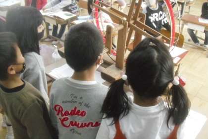 1年生の教室に持っていくと,みんなから「糸車や!」と歓声があがりました。