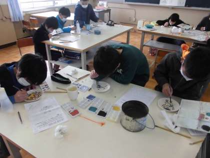 2月2日(火)には,京都色絵陶芸協同組合による「京焼・清水焼の絵付け体験学習」がありました。15センチメートル焼き物のお皿にいろいろな色の絵の具を使って絵付け体験をしましました。保育園の時にしたことがあると話していた子もいましたが,初めての経験の子どもも多く,お皿にどんな絵を描こうか,思いを広げながら素敵な作品を描いていました。