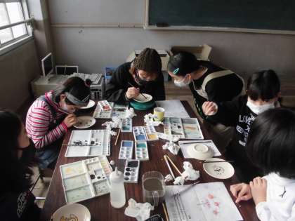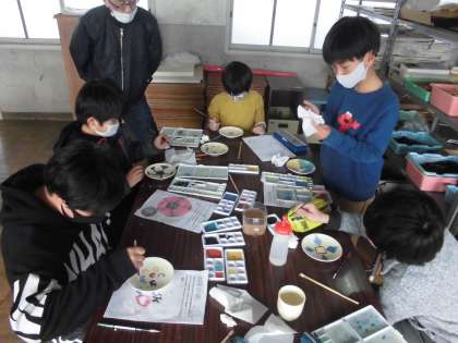 「京焼・清水焼の絵付け体験学習」では,4つの教室に分かれ,焼き物のお皿にいろいろな色の絵の具を使って絵付け体験をしました。世界に一つだけのオリジナルのお皿ができました。ろくろを使った皿の周りに円を描く様子にはみんな驚いていました。焼き上がりで,どんなお皿が完成するのか,とても楽しみです。