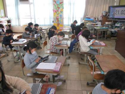 今日の算数は『三角形』の単元のまとめ,キュビナを使って学習しました。タブレット内でコンパスや定規を操作するのが苦手と感じる子どもが多かったですが,二等辺三角形や正三角形についての理解を深めることができました。