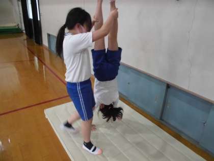 体育の学習では,マット運動に取り組んでいます。また,高学年になりましたので,倒立前転などの,難しい技にも挑戦したいと思います。今日は,2人組になって倒立などの練習をしました。初めての子も多く,バランスをとるのにコツがいるようです。少しずつ上達することができればと思います。