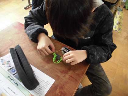 電気エネルギー利用の基本となるコイルを応用したモーターは,家庭電化製品をはじめ,多くの製品に使用されています。今日は,コイルを3回ほど巻いたコイルモーターをつくりました。モーターの回る仕組みが理解しやすく,自分で工作しながら,なぜ,どのように回り続けるかを学習しました。子どもたちは,くるくる回るモーターに驚いていました。
