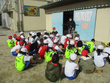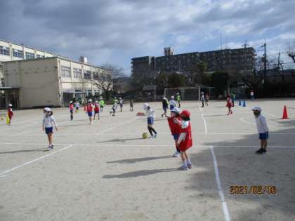 今日から体育のサッカーは1・2組合同,チームも混ぜてチーム編成し,接触しないように動けるスペースを決めてゲームをしました。動けない分パスをしっかりとしないとボールが回りません。まだルールに慣れていなかったり,パスがうまくいかなかったりするので,ゲームが止まることが多かったですが,一生懸命ゴールしようと頑張っていました。