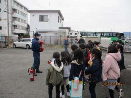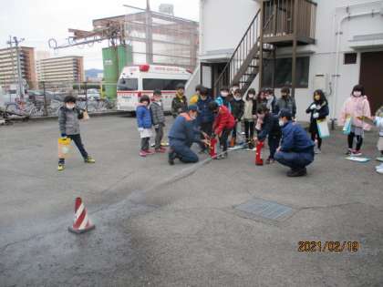 向島消防出張所で消火器体験の写真です。子どもたちはすごく楽しそうに消火器を使って学習できました。