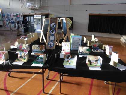 5年生は,「カラフルハーモニー」というテーマで彫刻刀で彫り進め,絵の具で丁寧に色付けをした「版画」と,「ミラクル ミラーステージ」の立体作品を出展しています。立体作品の背景と側面に鏡を使い,鏡を活かした世界を楽しみながら作りました。中の鏡を使うと,見えない部分が見えたり,形が広がったり,形が増えたりしてとても面白いです。鏡に映っている工夫や,鏡の中の世界にもご注目ください。
