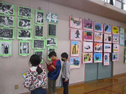 昨日の4時間目,今日の3時間目(雨で体育ができなかったため)は体育館へ行って図工展の鑑賞をしました。めあては,『好きな作品を見つけよう』。3年生の友達の作品から一つ,他の学年の作品から一つ好きな作品を見つけて,好きなところ・素敵なところをプリントに書きました。子ども達はいろいろな作品を見るのを楽しみにしていました。昨日今日と時間が取れたので,十分にゆっくり鑑賞できたように思います。そして,芸術作品に対する感性を豊かにできたことだと思います。