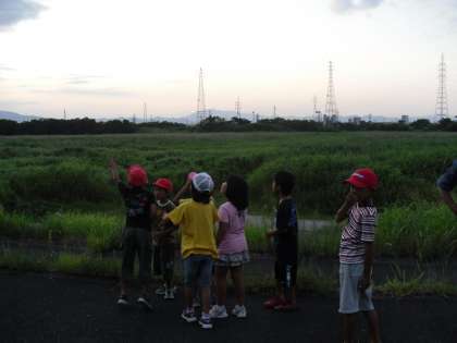 向島の宇治川河川敷に数万羽のつばめが集まってきます。8月3日夕方,その様子を観察指導員さんと希望者24名とで見に行きました。カメラには,写りませんでしたが,つばめの大群とそのスピードに驚きでした。