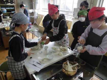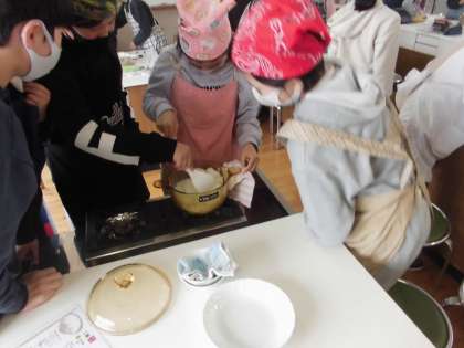 おいしくご飯を炊くには,給水の時間や水の量,そして火加減や加熱の時間などがおいしさの決め手になります。また,ガラスの鍋は中身が見えるので,米が動く様子や沸騰する様子に驚きながら,ご飯が炊けていく不思議さを感じて調理をしました。