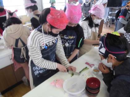 3月16日(火) に,家庭科の調理実習で,「みそ汁」を班ごとに作りました。みそ汁では,煮干しを使っただしのとり方や野菜の切り方,みそ汁の具を入れる順を考えながら,班で協力して作ることができました。