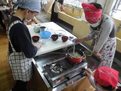 今回の調理実習も給食を食べた後でしたが,おいしそうに食べていました。自分たちで作ったお味噌汁は,だしが決め手の特別なみそ汁になりました。大根の切り方を工夫したり,煮干しをみそ汁の具として食べるようにしたり,どの班もオリジナルのお味噌汁が出来上がり大満足の様子でした。ぜひご家庭でも,お味噌汁づくりを子どもと一緒にしていただけたらと思います。