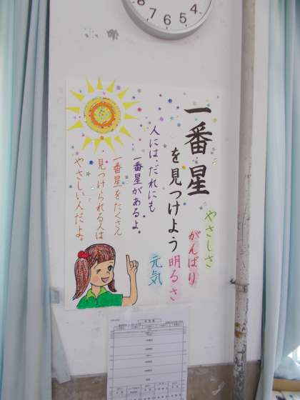 学級初めから教室にある掲示物。今日の道徳は,この掲示物に書かれている「一番星を見つける意味」を絵本「ひさの星」から考えました。授業を進めていくにつれて,「誰かのために頑張れる。誰かのためを思いやれる心が一番星だ。」ということが分かったようです。最後に,クラスの一番星見つけをしました。見つけたほうも,見つけてもらったほうも,にっこり笑顔でとっても温かい雰囲気になりました。これから毎日,学年の取り組みとしてやっていきます。