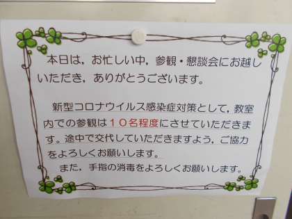 4年生5年生6年生の授業参観,学級懇談会でした。健康観察カードを持ってきていただいたり,教室内に入る人数を限定させていただいたりと,ご協力していただく点がたくさんあったかと思います。本当にありがとうございました。まだまだ続きそうですが,学校としてできる限りの対策を考えて行っていきたいと思います。引き続きご協力をよろしくお願いいたします。