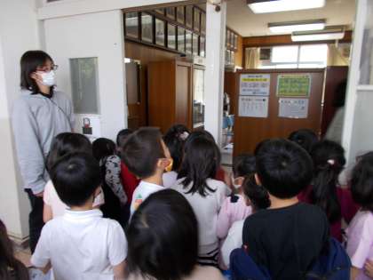 学校探検の様子です。今日は,前回行けなかった,体育館,校長室,図書室へ行きました。校長室は特に興味津々な子どもたちでした。