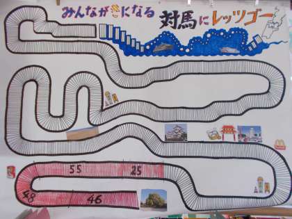 このみんなが走った周数。せっかくなので,毎回計算・合算して,どこに行くか目標を立てました。今年度は『対馬』。クラスの子の親戚がということで,今年はここを目指してみんなで走っています!