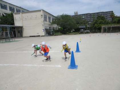 3年になって,2時間目になるリレーの学習です。バトンパスの練習をしてから,リレーをしました。チームで話し合って,リードの位置を決めるなど,みんなで力を合わせる態度がすばらしかったです。