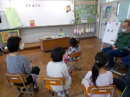 優しい音色のトーンチャイムを使って,音階を覚える学習をしました。みんなが途中まで音階を弾いて,選ばれた人が次の音を当てるゲームです。「ドレミファ」まで弾いて,みんなで「次は何の音でしょう。」というと,元気よく「ソ」と答えていました。楽しみながら学習することができていました。