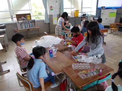 子どもたちが,楽しみにしていた図工の時間は,「光のプレゼント」をしました。ペットボトルや卵のパックに色を塗り,太陽に当ててその影を楽しむという活動です。「うわ!きれい!」「見て!こんな色になった!」ととっても嬉しそうに取り組んでいました。