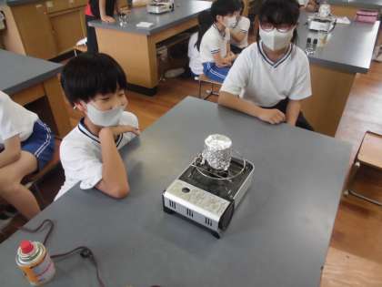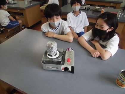 物の燃え方の学習では,新しい空気が入れ替わり酸素の働きが大切であることを実験を通して確かめてきました。今回は,空気が入らないようにして缶の中の木や紙を加熱して炭を作る実験をしました。物が燃えることや炭の作り方を確認することができました。