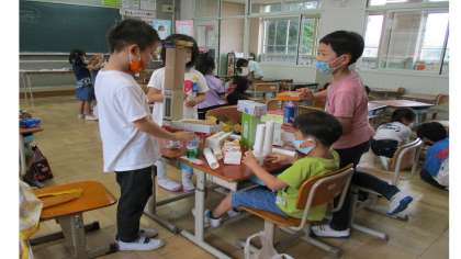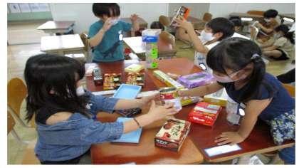 1年生算数「いろいろなかたち」の学習では,今日は,いろいろなかたちのものでいろいろなものを作りました。