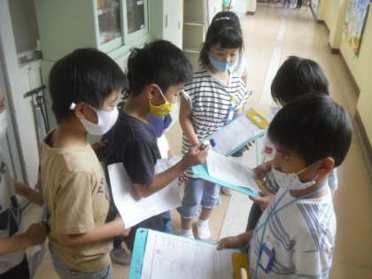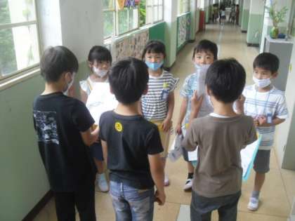 先日,学校探検を行いました。4月にも一度行いましたが,今回は一度も使用したことのない,教室が6部屋も増えました。そこで,2年生のお兄さん,お姉さんに各教室の説明をしてもらいました。1年生は,無事に教室までたどりつけるか心配な様子でしたが,どのグループも協力して探検することが出来ていました。2年生が優しく声をかけてくれたり,大きな声で分かりやすく説明をしてくれたりしたおかげで,ゴールした後の1年生の表情はとても輝いていました。堂々としていた2年生がとてもかっこよかったようで,1年生も2年生を目指して毎日頑張っていきたいと話していました。2年生,ありがとうございました!!