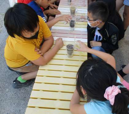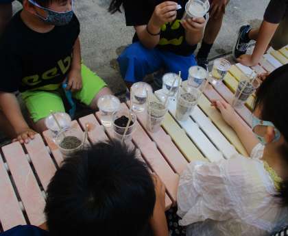 今日は,運動場のどこの土が,水がしみこむのが遅いのかを実験してみました。くすのきの近くの土,さらさらの校庭の土,花壇の土,砂利,巨椋池の土,砂場の砂の6種類を実験しました。結果は・・・さらさらの砂を集めた校庭の土が一番しみこみが遅かったです。
