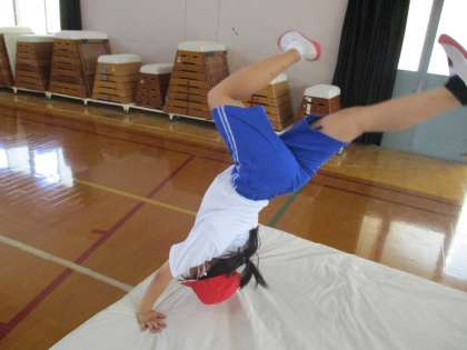 マット運動の様子です。倒立前転,倒立ブリッジ,飛び前転,ロンダート・・・。
