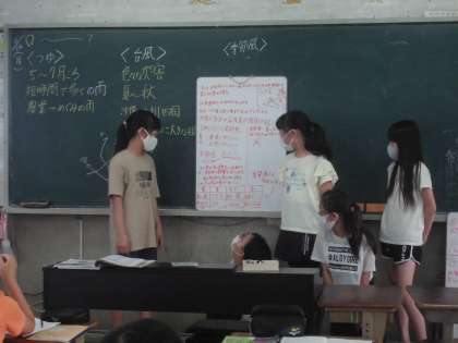 日本の気候の特色について,梅雨,台風,季節風に分かれて調べたことを発表しています。