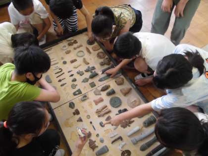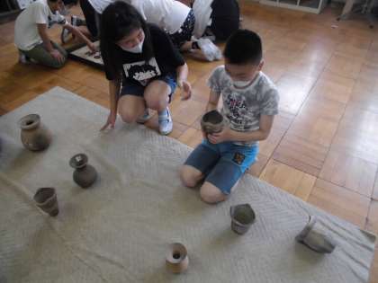 今週の社会では,縄文時代や弥生時代などのくらしの様子を想像しながら,古代の人々はどんな所に住み,どんな食べ物を食べ,どんな服を着ていたのだろうかといったことを,資料から考えたりしました。また,資料室の古代の土器の模型や土偶や石器などの模型を実際に手に取ってみながら,土器をどのように使っていたのか,どんな生活をしていたのか思いを広げることができました。子どもたちは,調べたことや学習してきたことをノートにまとめ,古代のくらしのイメージを膨らませていました。これからも歴史を体感しながら学習を進めていきたいです。