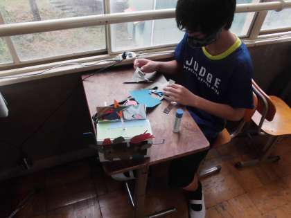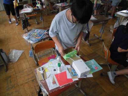 針金を曲げて作った仕組みで,針金につないだストローが上下に動く仕組みからイメージを広げて作品を作っています。色紙を細かく切って作品に貼ったり,絵を描いたりして動く仕組みのある作品を作っています。集中して頑張っていました。