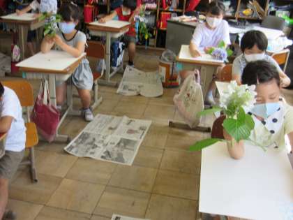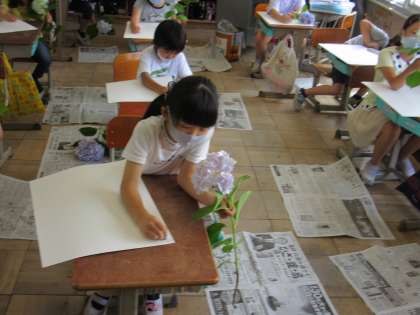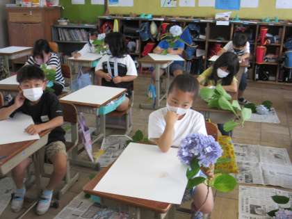 図工の時間に「あじさいの花」を描きました。花びらの色を工夫してぬりました。