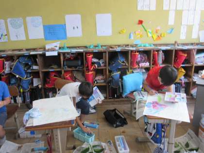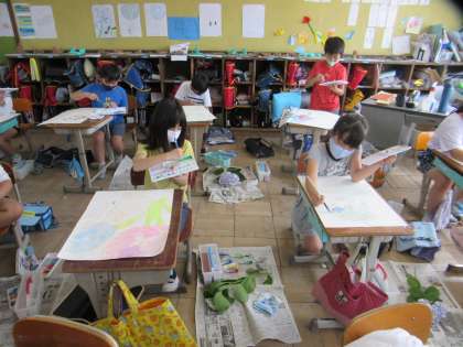 あじさいを描いた後,虫や花,小鳥なども描き,子どもたちは「あじさいランド」と名付けて創作活動を楽しみました。