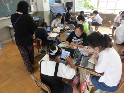 国語の学習では,提案する文章を書こうということをめあてに,学習を進めています。学校のみんなに,電気や水などの資源の大切さや,環境を大切にするためにみんなができることを提案したいと思います。どんなテーマにしようか話し合いながら,グループごとに相談し,タブレットを使って情報を集めています。