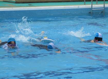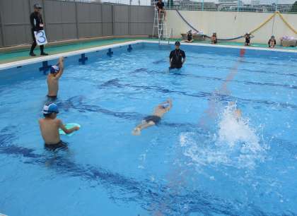 四年生の水泳学習の様子です。蹴伸びや伏し浮きなど,水中では,体の力を抜いて泳ぐ練習をしています。