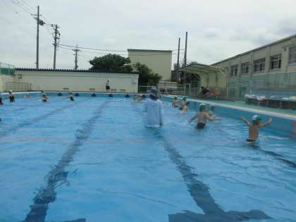 まずは水慣れ。 向かいの人と水中じゃんけんをし,勝った人が負けた人に水をかけます。 浮く練習もしました。