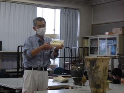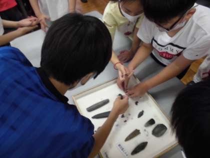 遺跡から発掘されたものは,土器のほかにもいろいろあるそうです。例えば,実際に使われていたい石包丁などの石器やきれいな勾玉,日本で作ったとされるお金など,本物を手に取りながら歴史を感じることができました。土の中から発掘された土器などから,いろいろな時代の人々のくらしが想像できたように思います。