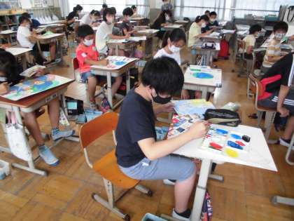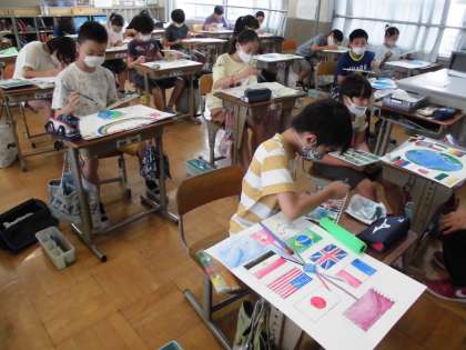 子どもたちの作品のテーマは,みんなの平和です。平和に対するイメージを広げて,平和ポスターを描いています。子どもたちは,世界の国旗や地球儀を描いたり,平和の象徴のハトや色々な国の民族衣装を着ている人たちなどを描いたりしています。他にも,争いのない世の中のイメージやみんなが笑顔で集まっているイメージの子どもたちもいます。どんな作品が完成するのかとても楽しみです。