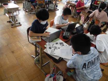 総合的な学習の時間には,平和について調べたことをまとめる活動をしています。子どもたちは,タブレットを使って資料映像などを自分で調べ,戦争について関連する情報を集めたり,図書室の本を活用し,自分の調べたいテーマでまとめています。戦時中の子どもたちの様子や人々のくらし,戦争までの歴史や日本の状況,戦後の復興の様子,太平洋戦争の様子や当時の人々の思いなどについて,少しずつ知ることを大切に学習を進めてきました。これからも,平和に対する思いを深めることができればと思います。
