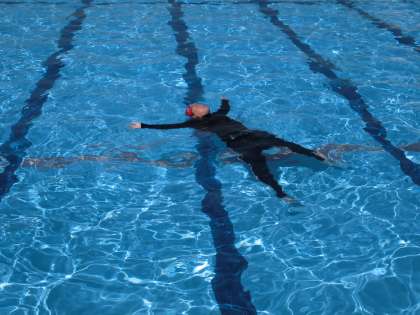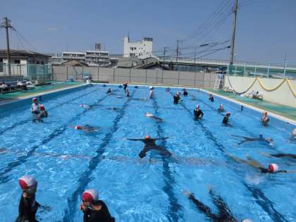 子どもたちが,水難事故などにあった時を想定して,水着の上に濡れてもよい長袖・長ズボンを着用し,水難事故から身を守る練習をしました。水の中での事故を防ぐには,慌てずに冷静に行動することやきまりやルールをしっかりと守ることなどが大切です。そこで,救助を待つ間,水の上で心を静めて浮かぶ練習をしました。力を抜くことや身体を大きく広げることなどがポイントです。