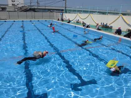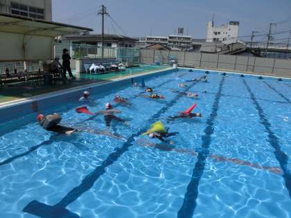 長い時間水の上で浮いているために,ペットボトルやドッジボール,ポリタンクやカラーコーンなど水に浮くことができるものを使って浮く練習もしました。子どもたちは,持ち方や使い方などを工夫しながら,どのようにしたら長い時間浮いていることができるか考えながら浮く練習をしました。