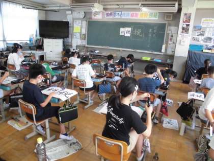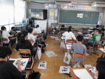 伏見区の習字コンクールに出展する作品を書きました。いつも以上に,緊張しながらも丁寧に書くことができました。また,とめやはらいにも気を付けながら,じっくりと書いていました。